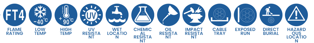 Manufactured, tested and certified in China, AC90 armoured building wire is rated FT4-ST1, -40°C to 90°C and engineered specifically for demanding environments and superior flammability & smoke emission performance.